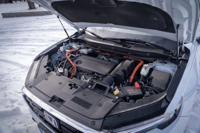 Також електромотор заводить ДВЗ, тож стандартна АКБ тут невеличка, стартеру не потрібно багато енергії. Саме через це 12-вольтовий акумулятор в CR-V невеличкий, тож взимку розрядити його легше. Цікаво, що режими передачі енергії під час руху можна спостерігати як на центральному екрані, так і на приладовій панелі.